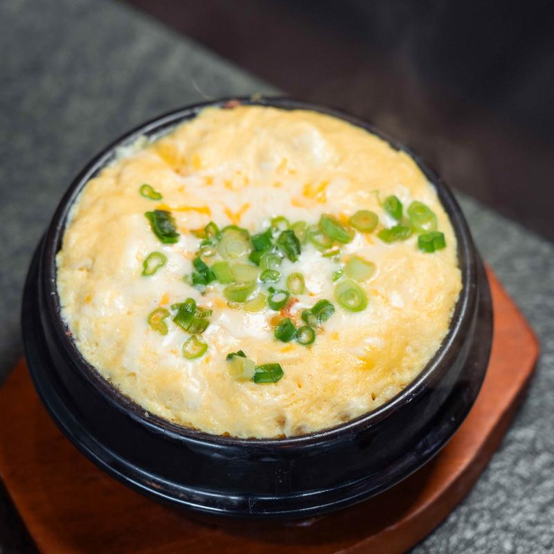 Korean steamed egg in a hot stone pot with vegetables and cheese.