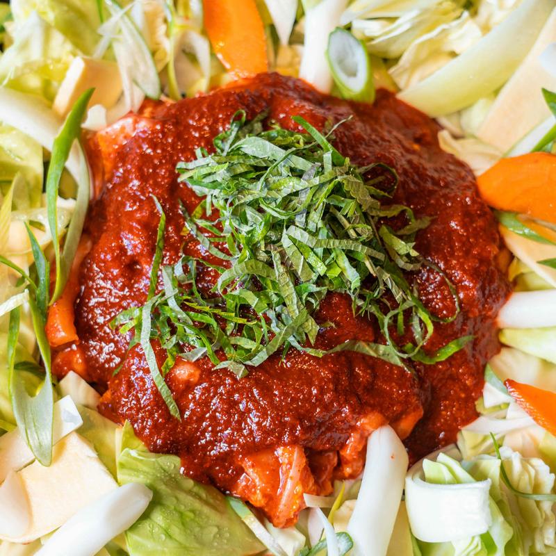 Spicy Korean-style stir-fried chicken in a traditional gochujang sauce.